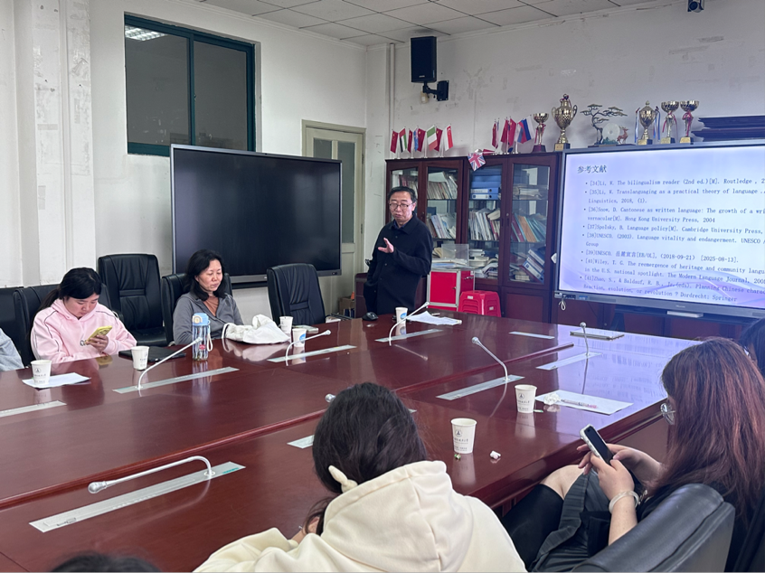 (通讯员 魏利华)4月9日下午,一场聚焦“语言生活、方言保护与数字化传承” 的教师学术沙龙在外国语学院402会议室顺利举行。本次沙龙邀请学院三级教授、外国语言学及应用语言学导师组王革老师主讲,深入剖析数字化时代方言保护的严峻挑战与创新路径,学院王彩豫、张平等老师到场学习、交流,研究生们积极参与。