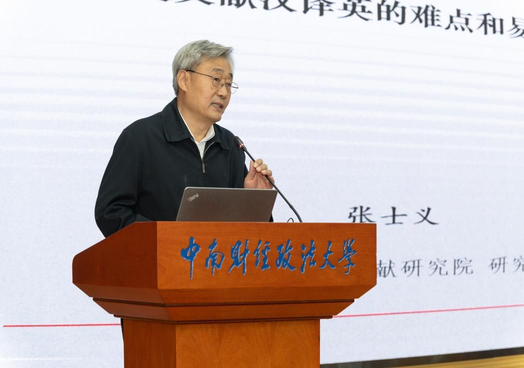 张士义作题为《党史文献汉译英的难点和易错问题》的报告,他指出党史文献翻译中的问题主要集中在对“会议、文件、机构、人物、事件”等的翻译错误,并在每一点问题中用鲜活案例剖析常见的错误类型、错译情况,并提醒所有人注意一些特定术语的含义辨别。