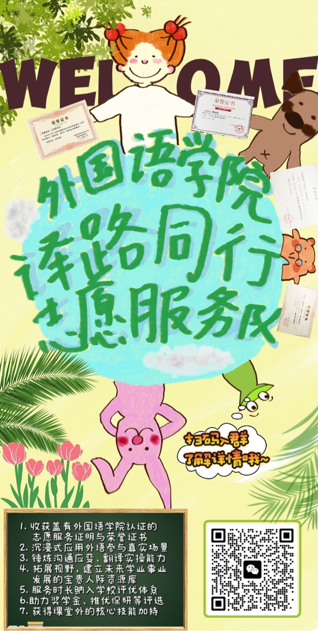 加入外国语学院“译路同行”志愿服务队,只要你怀揣着对志愿服务的热忱,拥有一份通过教学传递爱心的真心,欢迎你加入我们的大家庭!我们期待有责任心、积极主动、具备团队协作精神的小伙伴们的加入,一起为志愿服务事业添砖加瓦~