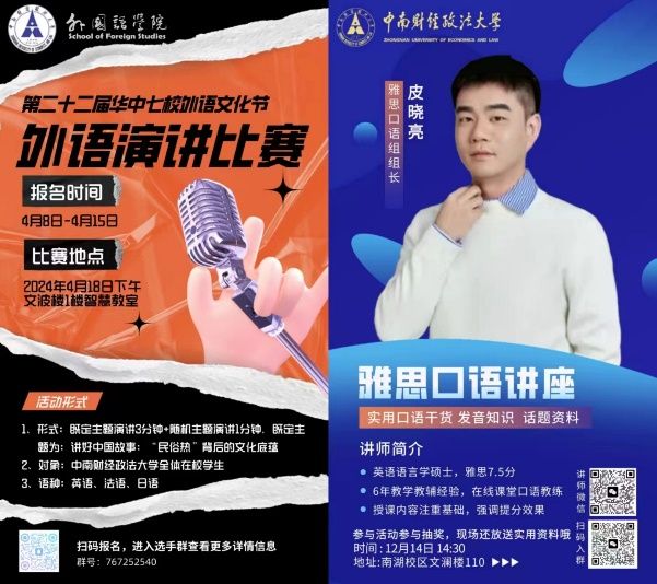 外国语学院作为中南大外语学习的先锋队,学习发展中心自然是外语活动的带头人。回顾去年,我们举办了各色活动,面向全校甚至全市获得了一致好评:“希望之星”演讲比赛、华中七校外语节、“商务英语技能大赛”、”未来之星”教学大赛……参与这些活动,你可以获得外语学习能力技能加成,在落落大方的演讲中提升自信,收获属于自己的荣誉,结交更多有共同爱好的朋友。