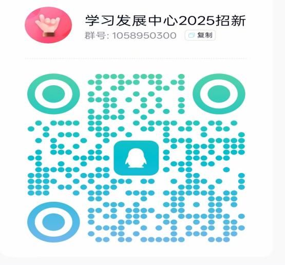 当然,如果你还有更多疑问,或者有加入学习发展中心的意愿,也请扫描下方二维码加入我们的招新群聊(招新群号:1058950300),师兄师姐们将为你一一解答~