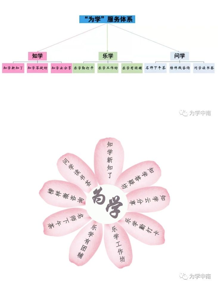 学习发展中心(简称学发),隶属于学生工作部,以服务学生学习发展为核心,以激发学习动力、培养学习能力、提升学习效能、整合学习资源和促进学生全面发展为主旨。中心立足校情,遵循教育规律,贯彻“为学,为你”的服务理念,关注学生个性化、多层次学习发展需求,努力提供全过程、全方位指导服务,在学生学习成长道路上提供支撑和守护。中南财经政法大学学习发展中心“为学”服务体系包括3个版块,共9个项目(如下图)。