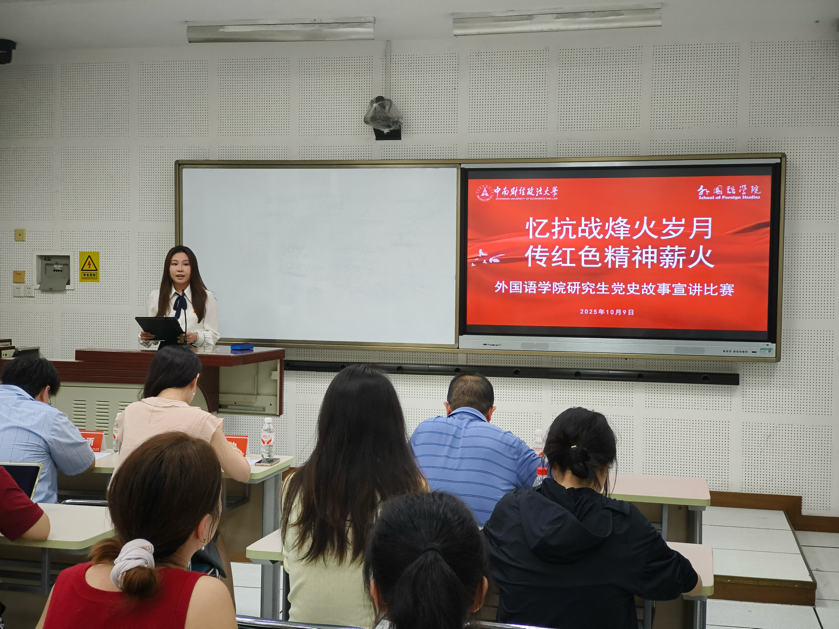 (通讯员 彭芬 姜欣 解淑贞)为深切缅怀革命先辈,传承伟大抗战精神,凝聚奋进新征程的青春力量,10月9日,外国语学院聚焦纪念中国人民抗日战争暨世界反法西斯战争胜利80周年这一历史节点,在文波楼210语音教室举办“忆抗战烽火岁月,传红色精神薪火”研究生党史故事宣讲比赛。学院党委委员、组织员袁经林,研工办主任张冉和研究生辅导员袁笑雨担任评委。