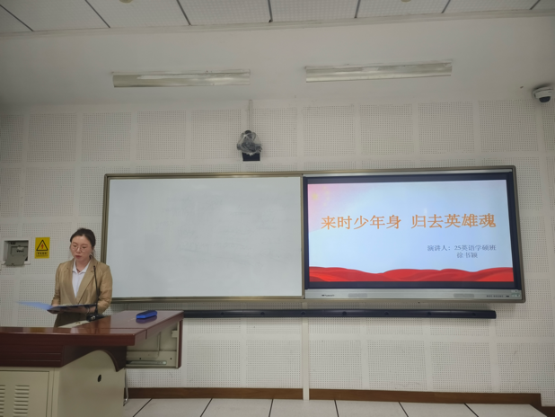 2025级英语笔译专业张润玉以“烽火铸丹心,百岁志如钢——致敬老兵李登月”为题,讲述了战士李登月少年从军、浴血奋战、战后投身教材编写的一生,号召青年学子传承老兵精神,为民族复兴不懈奋斗;2025级外国语言学及应用语言学专业徐书颖以“来时少年身,归去英雄魂”为题讲述杨靖宇等英烈及当代青年事迹,立志成为历史的“转译者”、精神的“传递者”,用外语讲好中国故事,赓续红色血脉;2025级英语笔译专业何冉冉以家乡河南信阳罗山的革命故事为切入点,生动讲述抗战时何大妈舍亲儿护红军战士的壮举,深刻诠释党群鱼水深情与红色信仰,呼吁新时代青年将红色基因融入血脉、铭刻入心;2025级英语笔译专业张赫则以“从‘半条棉被’到世界回响”为题,串联历史故事与精神根脉,号召外语学子以专业为桥梁,让党的历史故事跨越语言鸿沟、走向世界舞台。