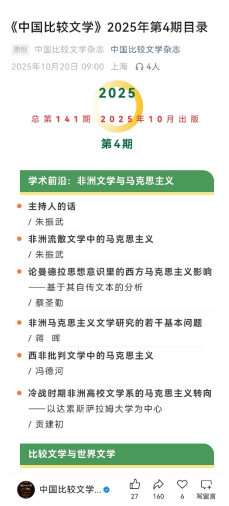 该专栏发表后,《中国比较文学》公众号、上海师范大学、浙江师范大学、《外国文学文艺研究》公众号等媒体,均隆重做出了推介,该栏目的论文发表是继《中国社会科学》杂志发表系列论文之后,汇集国内主要从事非洲研究的专业人员的近期成果,它将同另外一组高级别国际期刊发表的论文一起,成为里程碑意义上的标志性成果。