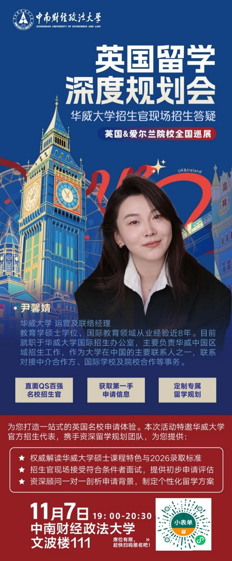 11月7日(周五)晚19:00-20:30,华威大学专场招生宣讲与英国留学咨询会将进校园!这场专为计划赴英攻读硕士的大二、大三、大四学生及毕业生打造的 “零距离对接会”,带你解锁英国顶尖名校的申请密码,一步到位规划留学与职业路径!