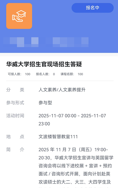 申请先机抢先占:提前线上预约,就能获得与招生官一对一面试的资格!这不仅是展示个人优势的绝佳机会,更可能成为你申请华威的 “加分项”,比其他申请者快一步锁定录取可能性!