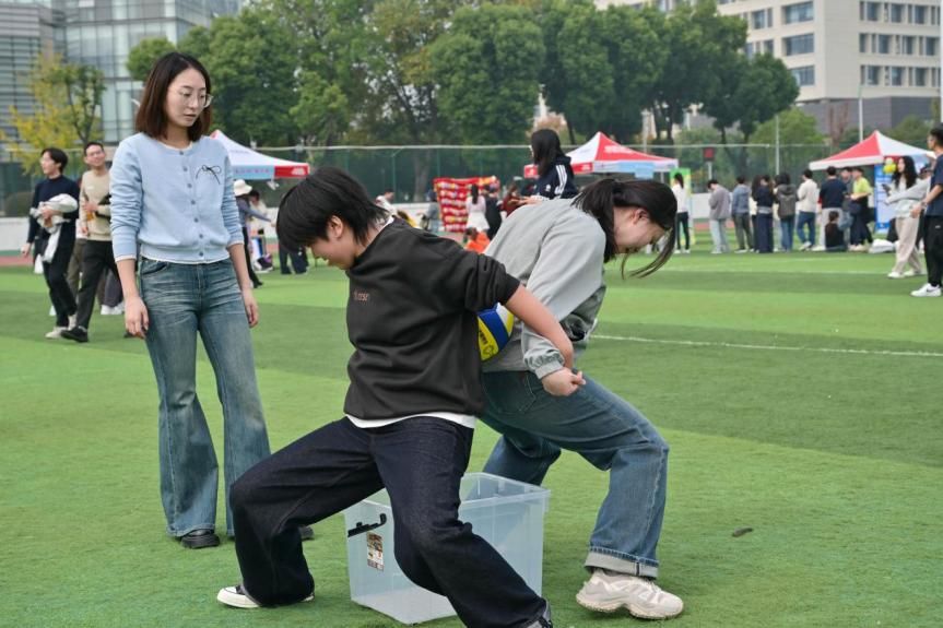 赛场上,选手们随机组队、默契配合,步调一致、稳步前行,在短时间的磨合中展现出良好的团队协作与拼搏精神。学院研究生踊跃参与,在竞赛中奋勇争先,展现了顽强拼搏的运动风貌,彰显了外院学子的昂扬精神与青春风采。现场欢声笑语与加油呐喊此起彼伏,汇成一片洋溢着青春活力的运动海洋。