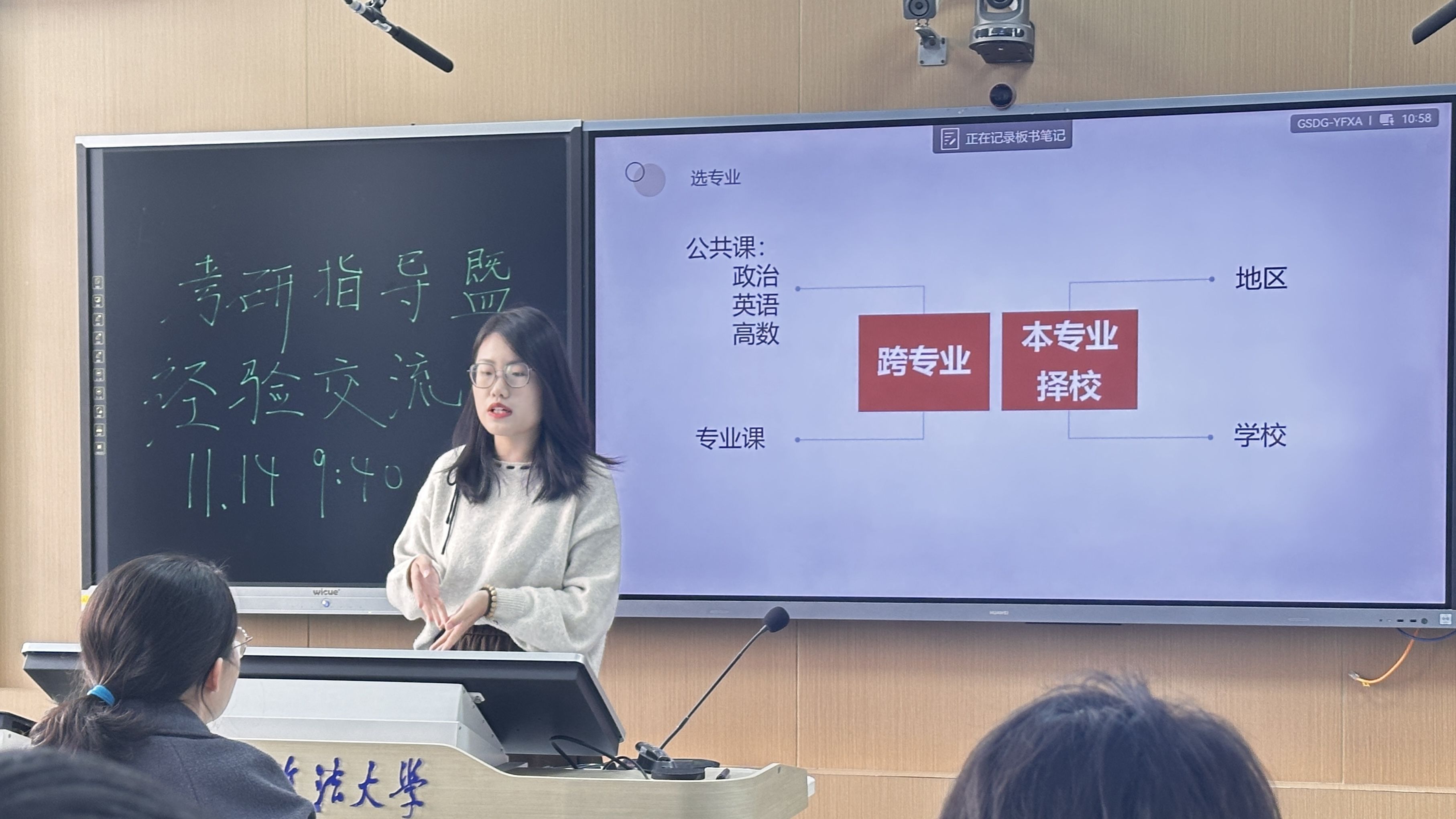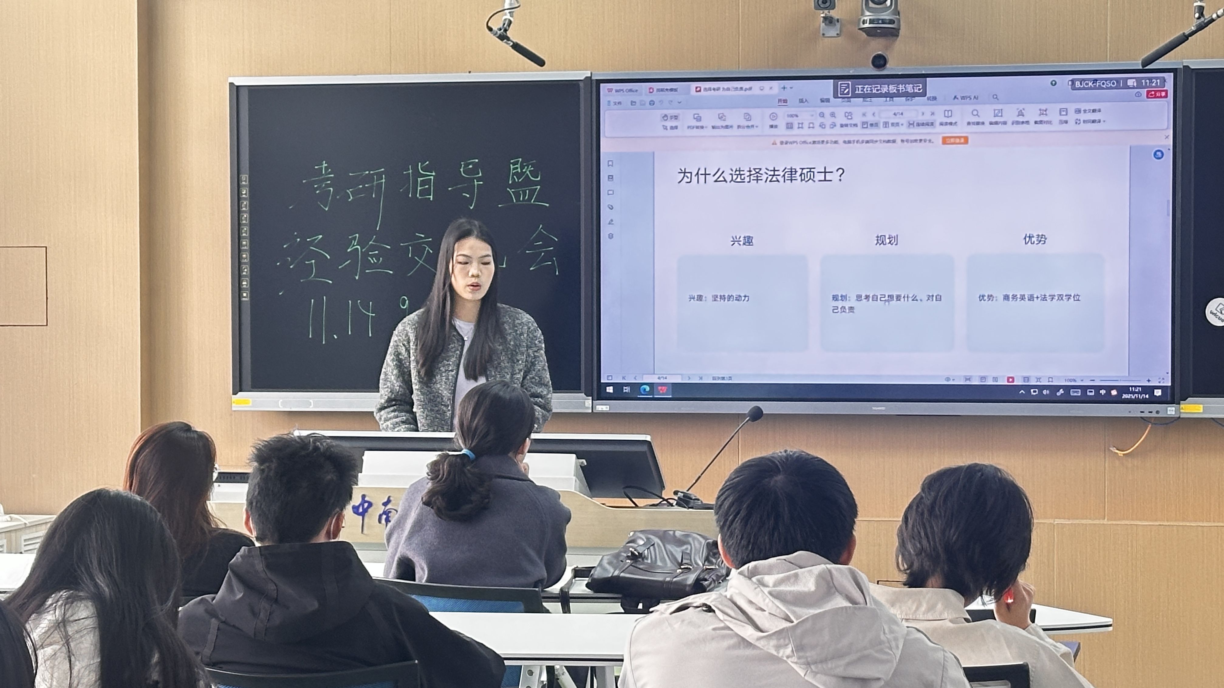 蒋伊婷(考取本校法学院)师姐详细介绍专硕和学硕的区别,帮助师弟师妹明确选择方向。师姐强调:既要通过高效规划提升学习效率,也要保持平和心态,避免受周边环境干扰,在探索中找到适配自身的学习节奏。