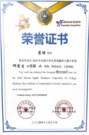 苏杨同学坚持“以考促学、以赛促学”的学习理念,在专业学习中取得扎实进步,英语专业四级、八级考试均获“优秀”等级,并考取CATTI二级笔译证书、高中英语教师资格证。她积极参与学科竞赛,在校期间获得第八届全国高校商务英语竞赛专业组初赛一等奖、决赛三等奖,还曾在全国大学生英语翻译大赛、全国大学生英语词汇竞赛、“优译杯”全国技术翻译大赛等比赛中获得奖项,在备考、备赛过程中持续提升专业综合能力。