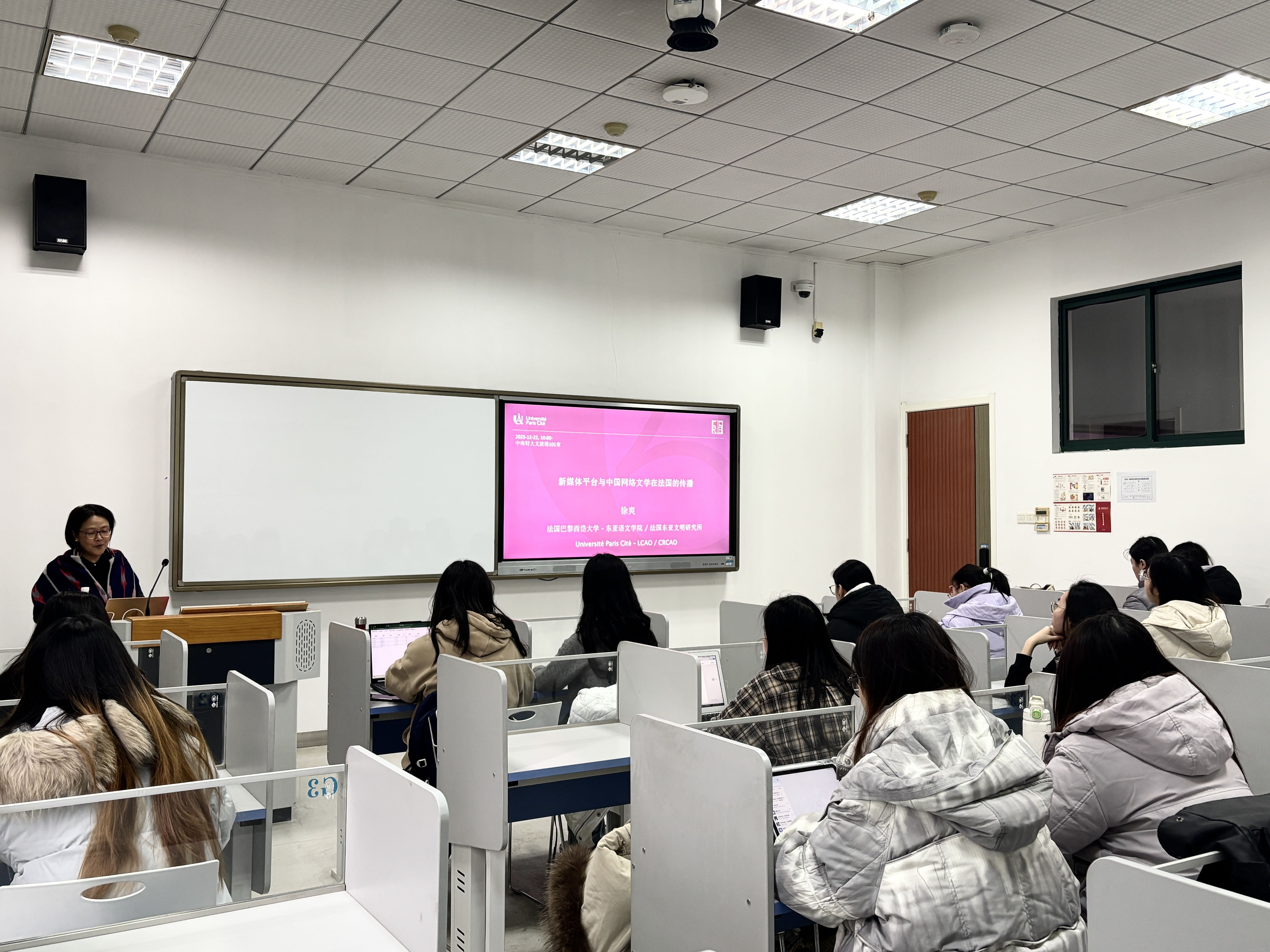(新闻撰稿:马梦遥,夏正华)2025年12月22日(周一)上午,我校“文澜学者”讲座教授,法国巴黎西岱大学东亚语言文化系中国当代文学教授徐爽,为法语专业大三学生作了题为《新媒体平台与中国网络文学在法国的传播》的专题讲座。本次讲座紧扣法语专业跨文化传播核心能力培养目标,结合法国年轻群体文化消费特征,系统解析中国网络文学出海法语区的传播路径,兼具学术深度与实践指导价值。