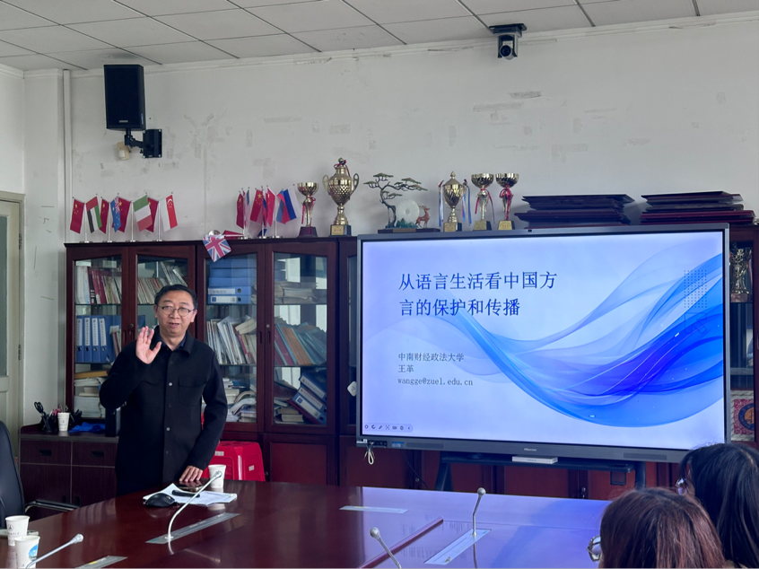 (通讯员 魏利华)4月9日下午,一场聚焦“语言生活、方言保护与数字化传承” 的教师学术沙龙在外国语学院402会议室顺利举行。本次沙龙邀请学院三级教授王革老师主讲,深入剖析数字化时代方言保护的严峻挑战与创新路径,学院王彩豫、张平等老师到场学习、交流,研究生们积极参与。沙龙由谢梦雅主持。